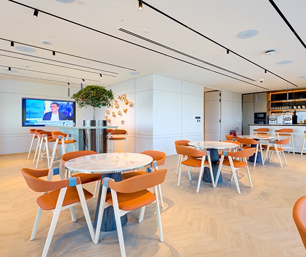 مساحة مشتركة بتصميم مفتوح توفر بيئة مثالية للاستراحة والتعاون بين الفرق مع خدمات الضيافة.